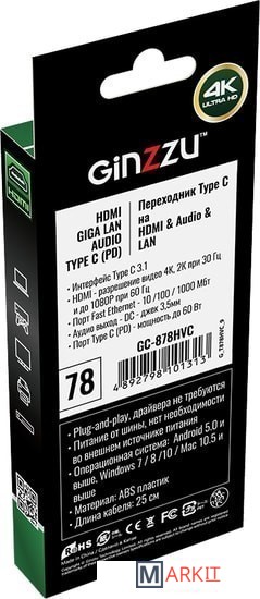 Переходник USB Type-C на HDMI & RJ45(GIGALAN) и Audio & USB Type-C;Порт USB Type-C - мощность до 60 Вт;Порт Fast Ethernet -10/100/1000 Мб/с;Корпус: ABS пластик.Поддержка HDMI 4K при 30 Гц и до 1080P при 60 Гц. Совместим с большинством HDTV, мониторов, проекторов и других устройств с портом HDMI.Нет необходимости устанавливать драйверы или внешний источник питания.