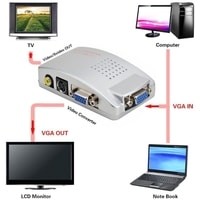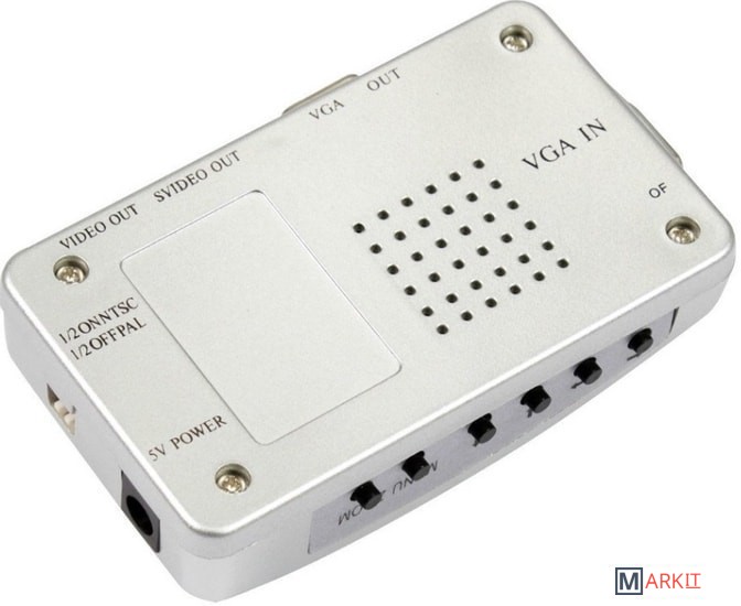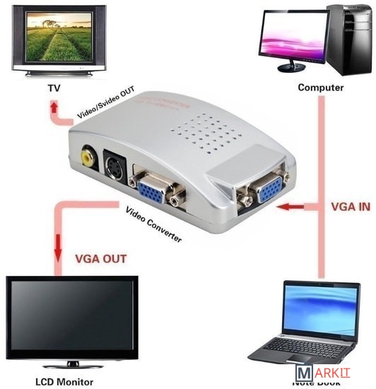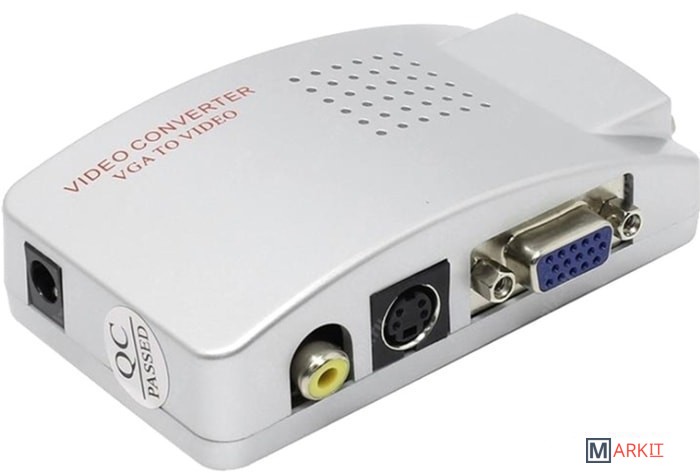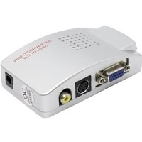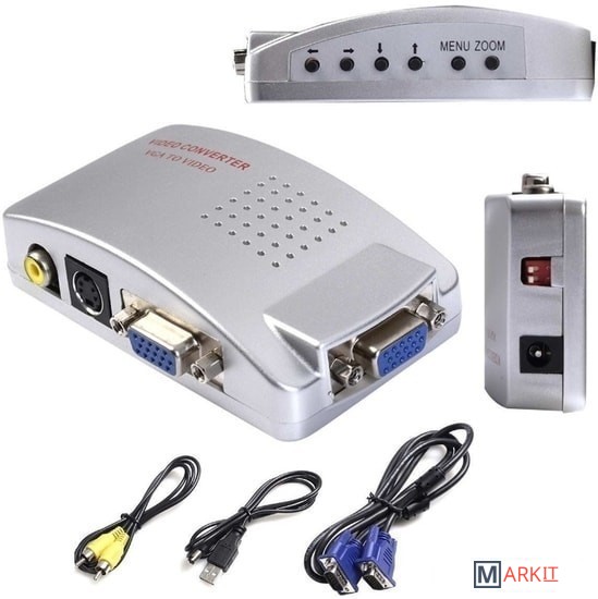 Адаптер / переходник / конвертер / преобразователь VGA – AV (RCA) или S-video – преобразует композитный CVBS видеосигнал в аналоговый VGA сигнал (только в этом направлении). Адаптер отлично подходит для подключения камеры CC TV, DVD / Blu-Ray-плеера, цифрового спутникового телевидения к телевизору, монитору, проектору с портом VGA. Все кабели для подключения адаптера в комплекте.