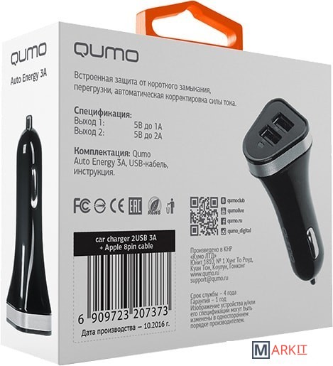Markit » Зарядные устройства » Автомобильное зарядное QUMO Auto Energy 3A + кабель Apple 8 pin