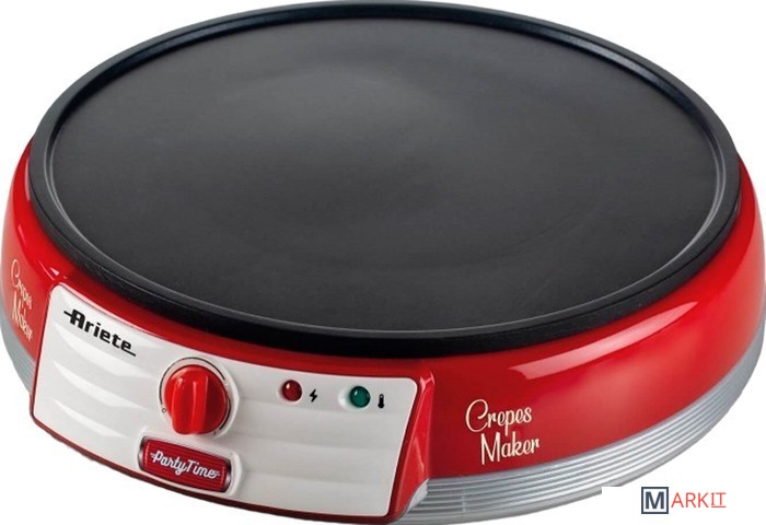 Блинница Ariete 202 Party Time, как и все устройства из серии Party Time, выполнена в ретро-дизайне.Форма прибора и антипригарное покрытие позволяют с легкостью испечь идеально поджаренные, румяные, ровные и тонкие блинчики.Не потребуется даже использовать масло. Управление прибором – несложное и удобное: на передней панели расположены световые индикаторы и регулятор уровня нагрева.В комплекте, помимо специального деревянного шпателя для разравнивания теста, поставляются деревянная лопатка для деликатного переворачивания и снятия готового блинчика.Приготовьте заранее жидкое тесто для блинчиков. После включения прибора в сеть, задайте при помощи регулятора нужную температуру нагрева (от 125° до 180°) и следите за зеленым индикатором. Как только он отключился - блинница готова к работе. Порцию теста аккуратно налейте на разогретую поверхность. Специальным шпателем разровняйте тесто ровным слоем по всей жарящей поверхности.