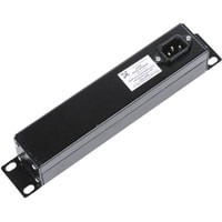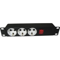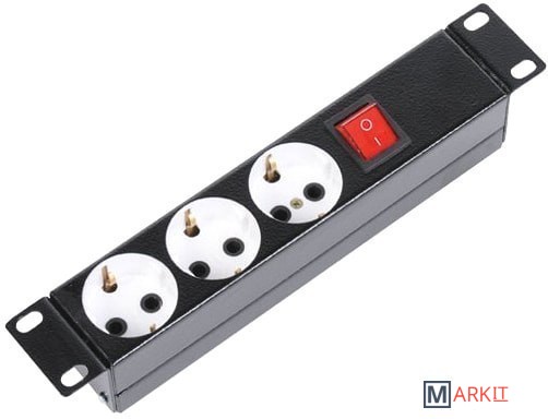 Блок имеет три розетки, выполнен в металлическом корпусе. Предназначен для размещения в 10” шкафах. Розетки расположены горизонтально, для удобного подсоединения коленчатых штекеров. На лицевой части блока установлен выключатель