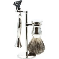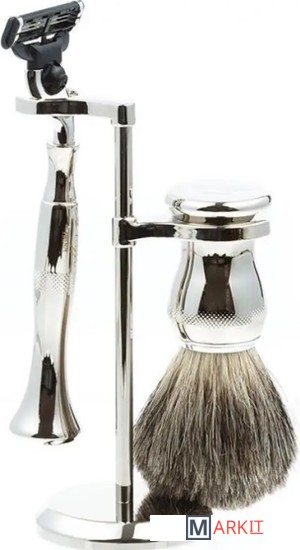 Бритвенный станок, совместимый с кассетами Gillette MACH3 (одна кассета в комплекте).Помазок с барсучьим ворсом.Материал рукояти: каучуковая смола, никелированная латунь.Подставка из металлического сплава.