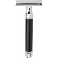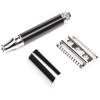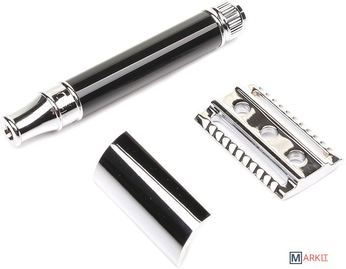 Элегантная традиционная бритва с ручкой, выполненной в черном цвете. Тип гребня — закрытый. Хромированные элементы придают особый шарм бритве. Станок состоит из трех частей. Каждая деталь бритвы идеально выполнена специалистами, чтобы сделать Ваш процесс бритья удовольствием. Устройство очень хорошо сбалансировано. Созданный вручную в Шеффилде, Англия. В комплект входит одно бесплатное лезвие Feather.