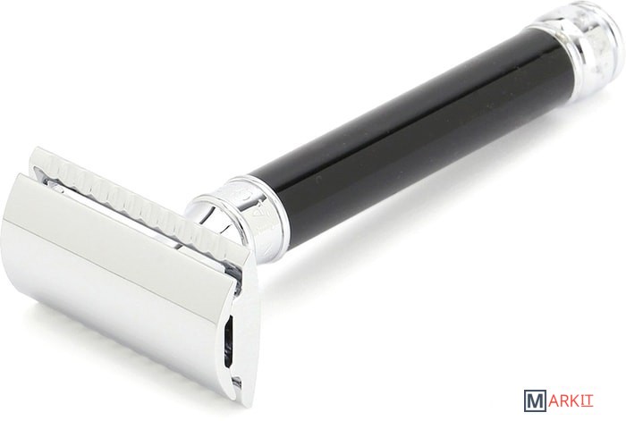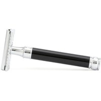 Элегантный традиционный станок с удлиненной ручкой цвета черной смолы. Бритва с закрытым гребнем и состоит из трех частей. Хромированные элементы украшают бритву и делают ее не только желанным аксессуаром, но и превосходным подарком. Бритва предназначена для ежедневного бритья. Долговечность бритвы позволит сэкономить на бритье не одну тысячу рублей.Длина ручки - 102 мм.