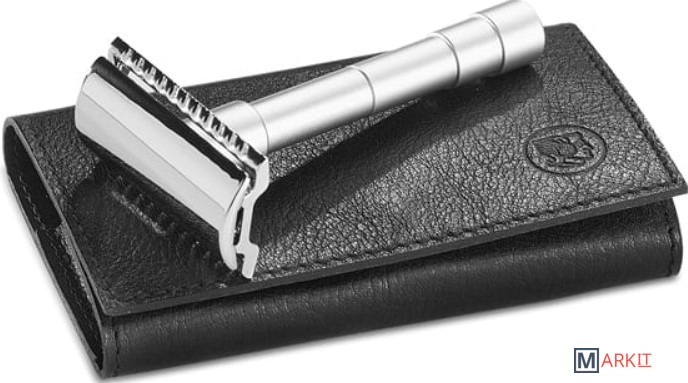 Станок Т- образный для бритья MERKUR сатинированный, разборный, в чехле из натуральной воловьей кожи, лезвия в комплекте (10 шт).Разборный Т-образный станок для бритья MERKUR 9046002 имеет закрытый гребень, что обеспечивает более безопасное мягкое бритье. Такой станок идеально подойдет для новичков. Станок выполнен из высококачественной сатинированной стали. Станок разбирается на 3 части и складывается в чехол из натуральной воловьей кожи. В чехле также есть отдельный кармашек для упаковки лезвий. Благодаря разборной конструкции и удобному компактоному чехлу этот станок станет идеальным спутником в путешествии.