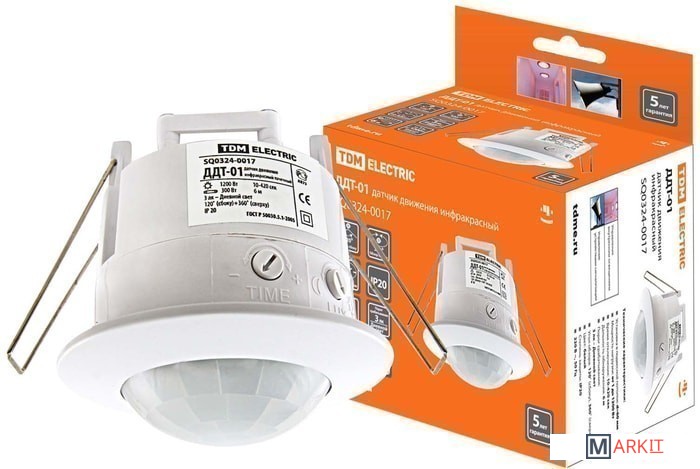 Для автоматического включения и отключения нагрузки в заданном интервале времени при появлении движущихся объектов в зоне обнаружения датчика и в зависимости от уровня освещенности в однофазных электрических сетях переменного тока напряжением 230В и частотой 50Гц.Имеется возможность регулировки порога срабатывания датчика в зависимости от уровня освещенности от 5 Лк до уровня солнечного света.Имеется возможность регулировки времени отключения датчика от нескольких секунд до нескольких минут.Монтаж к поверхности осуществляется при помощи саморезов и дюбелей, входящих в комплектацию.В качестве коммутирующего нагрузку элемента использовано электромеханическое реле.Датчики ДДТ-01 и ДДТ-02 встраиваются в подвесной потолок с диаметром установочного отверстия 65 мм и 40 мм соответственно.До 1200 Вт.Угол обнаружения сбоку составляет 120°.Угол обнаружения сверху составляет 360°.Дальность 6 м.