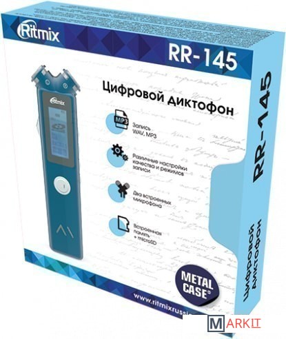 Ritmix RR-145 – цифровой диктофон в компактном металлическом Hi-Tech корпусе с информативным матричным дисплеем. Модель оснащена двумя встроенными высокочувствительными микрофонами для записи естественного стереозвука. Поддерживает различные настройки качества и режимов записи, а также имеет функцию музыкального плеера.Диктофон интуитивно понятен в управлении, запись начинается нажатием всего одной кнопки либо при помощи голосовой активации, форматы не требуют конвертации, а запись автоматически сохраненяется при низком заряде батареи.