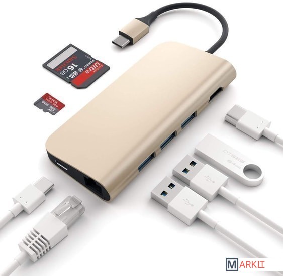Все разъемы на адаптере USB-A 3.2 Gen1 (5 Гбит/с), HDMI, RJ-45