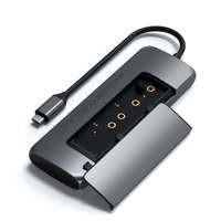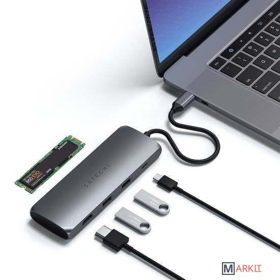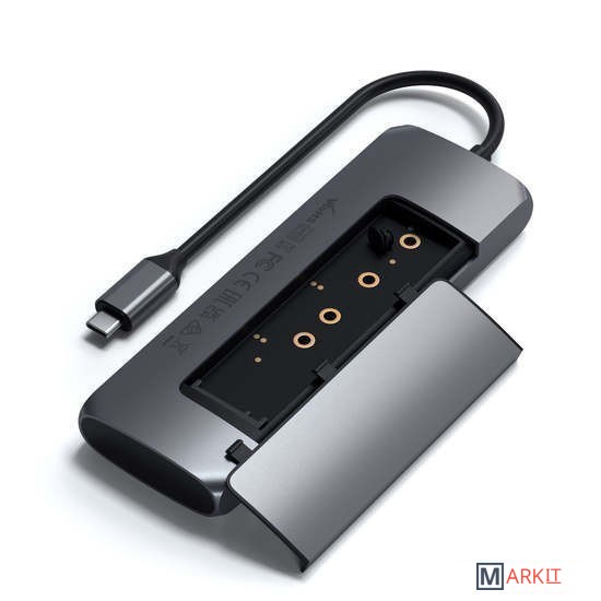 Устройство сочетает функции многопортового USB-C адаптера и бокса для M.2 SSD. Подходят только SATA M.2 накопители с размером 2230, 2242, 2260 и 2280. NVMe SSD не поддерживаются.Адаптер оснащен выходом на внешний монитор через HDMI с разрешением до 4K 60 Гц. Поддерживает зарядку USB-C PD и имеет двва порта USB-A. Все это подключается лишь одним проводом USB-C.