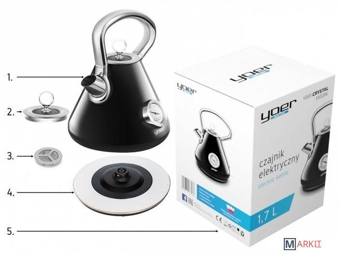 Крышка с кристаллами СваровскиВыпуклый носикСъемный металлический фильтр для накипиИндикатор температуры-Чайник оснащен специальным термометром для индикации текущей температуры воды. Это позволяет легко проверять и регулировать температуру воды в соответствии с индивидуальными потребностями без необходимости использования сторонних термометров.Эта функция особенно полезна при приготовлении напитков или тортов, требующих определенной температуры для достижения наилучших результатов.Контроллер StrixОтсек для хранения шнура питанияПротивоскользящие ножкиТермостойкая хромированная эргономичная ручкаКорпус из нержавеющей стали покрыт глянцевой эмальюПереключатель с подсветкойНагреватель: скрытый, пластинчатыйОснование: поворотное, 360 °Декоративные элементы: хромированные детали, крышка с кристаллами Swarovski, основание с декоративным кольцом.Прочее: изогнутый носик, съемная крышка, большой наполнитель для чайника, компактные размеры.Штепсельная вилка польская 220-240V 50 / 60Hz
