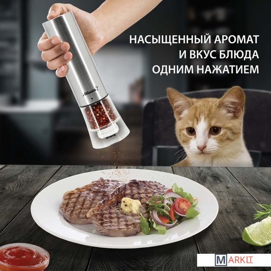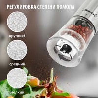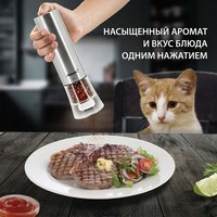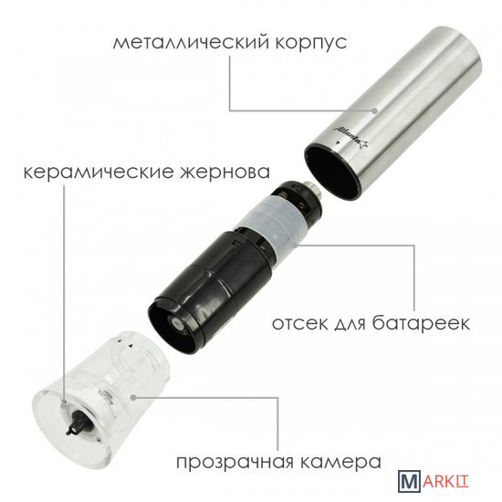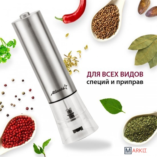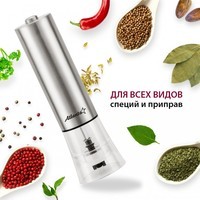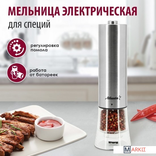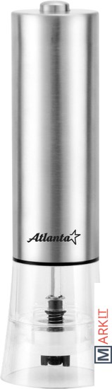 Мельница электрическая для специй Atlanta, работа от 4хАА батареек. Долговечный керамический механизм, корпус из высококачественной нержавеющей стали. Ругулировка степени помола. Стильный минималистичный дизайн.