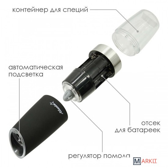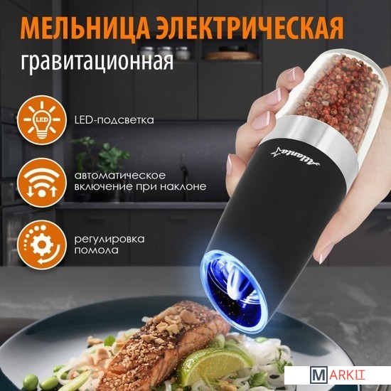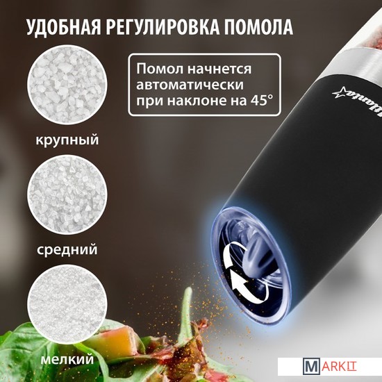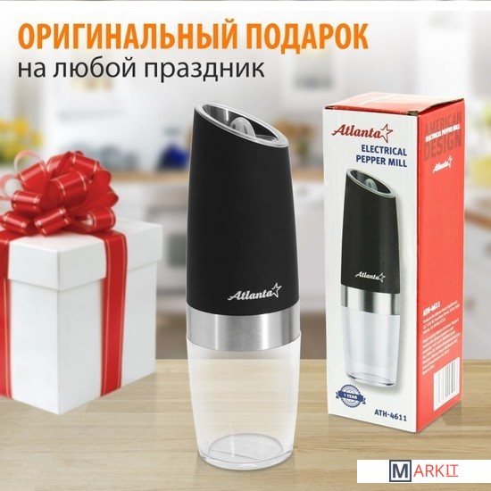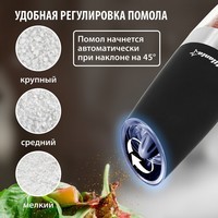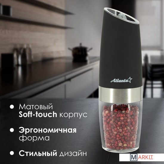 Мельница электрическая гравитационная для специй Atlanta. Долговечный керамический механизм, автоматическое включение при наклоне. Регулировка степени помола, подсветка, работа от батареек. Корпус с матовым покрытием soft-touch. Стильный минималистичный дизайн.