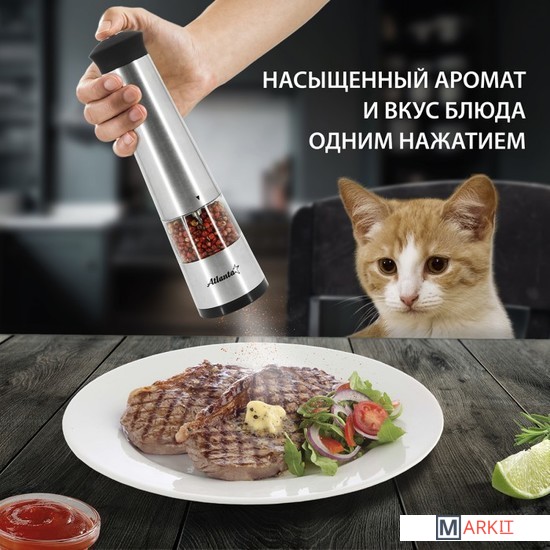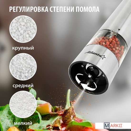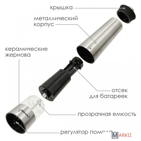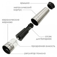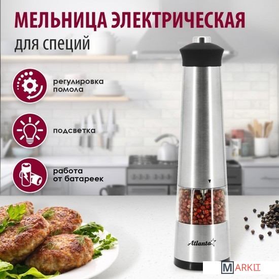 Мельница электрическая для специй Atlanta, работа от 4хАА батареек. Долговечный керамический механизм, корпус из высококачественной нержавеющей стали. Ругулировка степени помола. Стильный минималистичный дизайн.