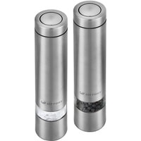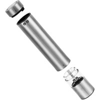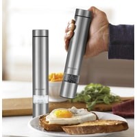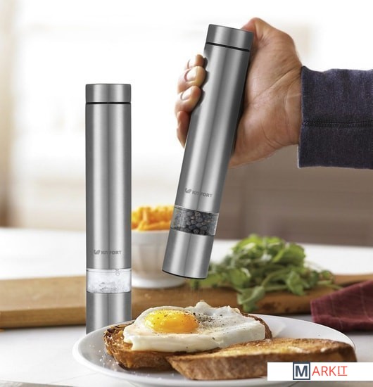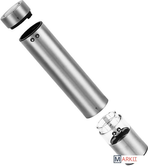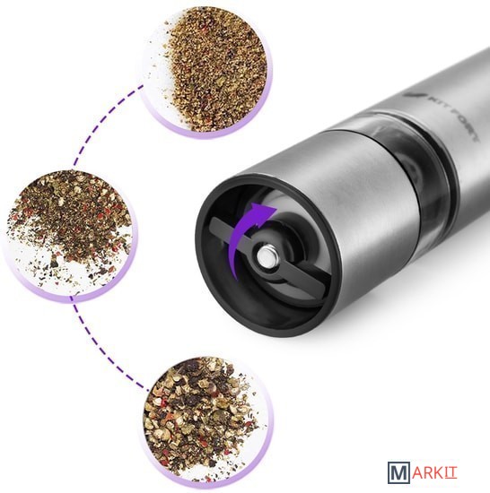 Степень помола легко регулируется винтом. Мельница удобно лежит в руке, включается одной кнопкой и работает от 4 батареек. Во время помола снизу загорается светодиод, он освещает блюдо, чтобы было лучше видно количество специй.