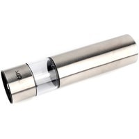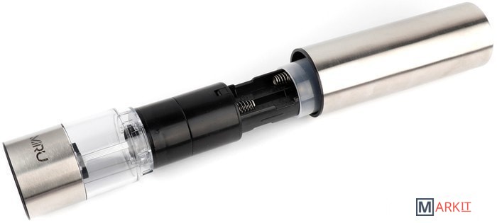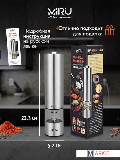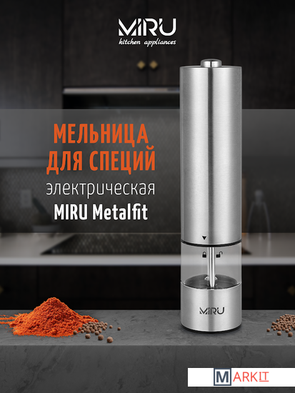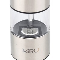 Электрическая мельница для специй MIRU METALFIT KA023 станет незаменимым помощник для каждой хозяйки. Она способна с высокой эффективностью перемалывать соль, перец или набор специй. Для работы устройства необходимо вставить 4хAA батарейки (в комплект не входят), наполнить колбу специями и нажать кнопку включения. Устройство перемелет необходимое количество пряностей. Принцип работы основан на взаимодействии двух керамических жерновов, представляющих собой два круга, один из которых закреплён неподвижно, а другой под воздействием электричества приходит в движение, перемалывая специи. Керамика ценна тем, что она никак не влияет на вкус специй, в отличие от других материалов, способных оставить лёгкий привкус.Особенности:- Керамические жернова.- Регулировка тонкости помола.- Объём 75 мл.- LED-подсветка.- Питание от 4хAA батареек (в комплект не входит).- Удобная кнопка включения.
