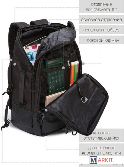 Рюкзак молодежный,два отделения,карман на молнии на передней стенке,боковой карман,две пары боковых стяжек на фастексах,внутренний держатель для ключей - фастекс,внутренний карман для электронных устройств,внутренний составной пенал-органайзер,укрепленная спинка,карман быстрого доступа в верхней части рюкзака,карман быстрого доступа на задней стенке,дополнительная ручка-петля,мягкая укрепленная ручка,нагрудная стяжка-фиксатор,укрепленная ручка,укрепленные лямки,предусмотрено крепление к чемодану