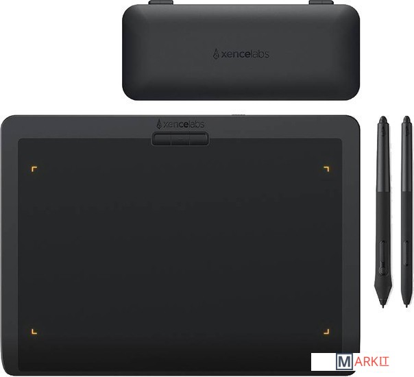 Поставляется с двумя беспроводными перьями. Перья отличаются размером и толщиной. У тонкого пера присутствуют 2 дополнительные кнопки, а у более крупного пера их 3 — они подходят для художников, работающих с 3D-графикой. Оба пера имеют функцию ластика и чувствительность к нажатию (8192 уровней), могут распознать наклон и при работе срабатывают практически без задержек.