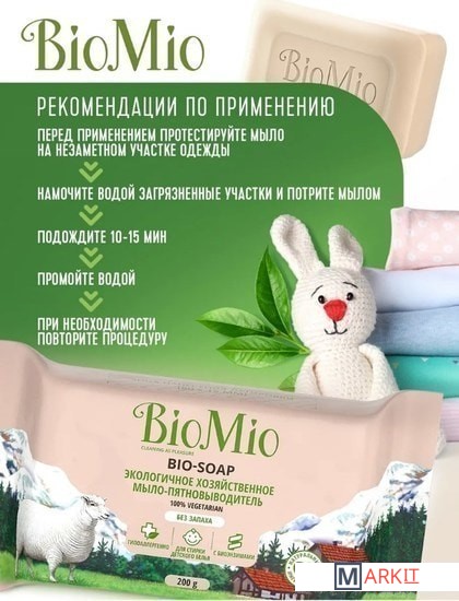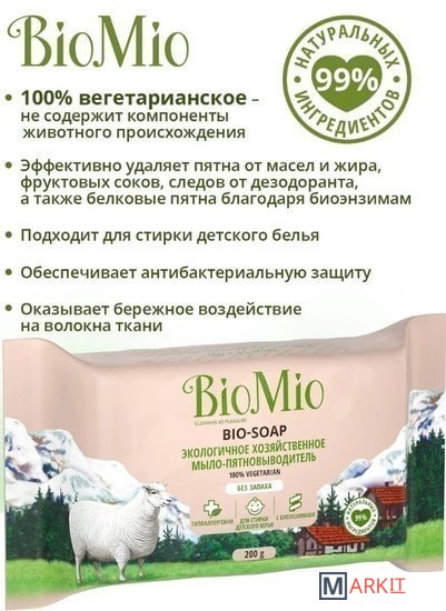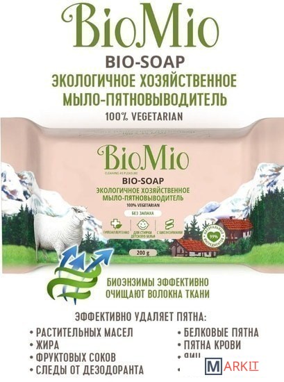 Экологичное хозяйственное мыло-пятновыводитель BIO-SOAP эффективно удаляет пятна от растительных масел и жира, фруктовых соков, следов от дезодоранта, а также белковые пятна (в том числе пятна крови, яиц, молока) благодаря специальной формуле, обогащенной биоэнзимами.Мыло гипоаллергенно, благодаря чему отлично подходит для стирки детского белья и одежды людей с чувствительной кожей.Специальная формула с оливковым маслом и глицерином обеспечивает бережный уход за кожей, а ионы серебра обладают антибактериальным эффектом.Прямоугольная форма мыла очень удобна в использовании, а непромокаемая упаковка флоу-пак подходит для многократного применения, что позволит хранить мыло в чистоте и порядке.Мыло BioMio – 100% вегетарианское – в его составе отсутствуют компоненты животного происхождения.НЕ СОДЕРЖИТ: ПЭГ, красители, синтетические ароматизаторы, ЭДТА, продукты животного происхождения.
