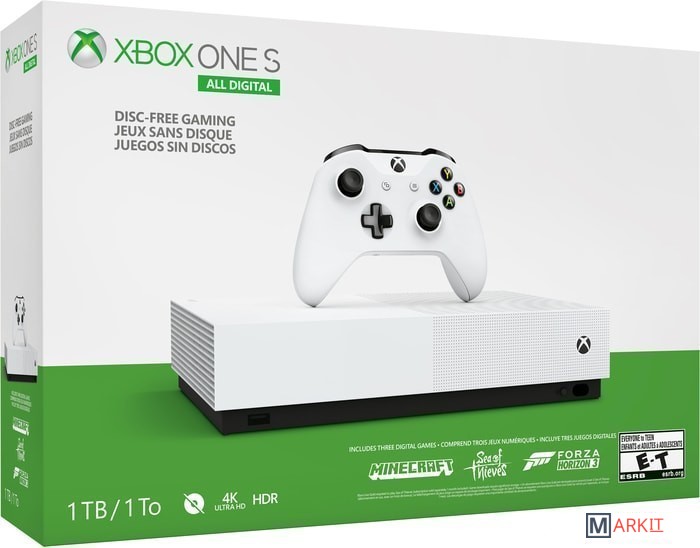 Компания Microsoft 17 апреля 2019 г. представила версию Xbox One S без оптического привода. В остальном, новая консоль идентична обычной версии Xbox One S.