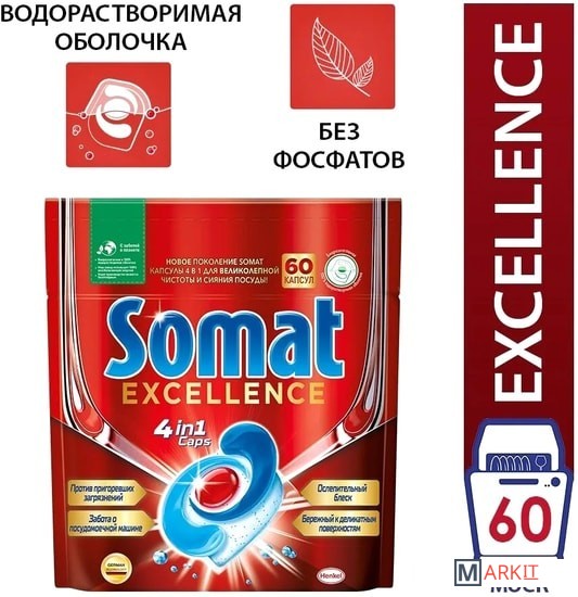 Somat Excellence 4in1 -это Многофункциональная капсула премиум-класса, состоящая из порошка и 3 уникальных гелевых камер в био-разлагаемой водорастворимой оболочке. - Глубокая очистка пригоревших загрязнений.- Ослепительный блеск.- Защита деликатных поверхностей.- Уход за посудомоечной машиной.