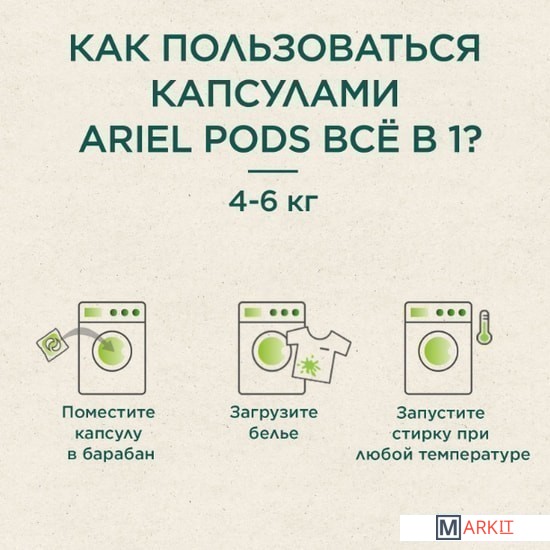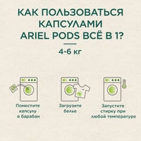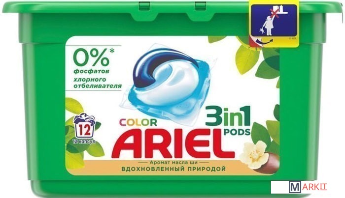 Капсулы для стирки ARIEL Pods Всё-в-1 Color Аромат масла ши - невероятная чистота в одной маленькой капсуле. Капсулы для стирки Ariel Pods Всё-в-1 Масло Ши Аромат Природы имеют уникальный многосекционный дизайн, позволяющий надежно сохранять компоненты в отдельных секциях капсулы до начала стирки, и обладают высококонцентрированными очищающими свойствами. Инновационная пленка капсул для стирки Ariel полностью растворяется при контакте с водой, позволяя мощным технологиям удалять различные виды пятен. Одна капсула содержит необходимую для стирки дозу лучшего жидкого средства от Ariel. Используйте в сочетании с кондиционерами для белья Lenor для придания дополнительной мягкости и свежести. ВНИМАНИЕ. Этот продукт может быть опасен и может нанести серьезные травмы. Храните капсулы Ariel Pods в недоступном для детей месте.Состав: >30% Анионные ПАВ, 5-15% Мыло,