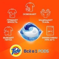 Капсулы для стирки TIDE Всё в 1 Color — это потрясающая эффективность всего в одной капсуле. Кристальная чистота и никаких следов. Попробуйте инновационное средство для стирки от Tide — Tide ВСЁ в 1 PODS. Каждая капсула состоит из 3 секций — таким образом, ее ингредиенты не смешиваются до начала стирки. При контакте с водой специальная инновационная пленка растворяется, и капсула начинает свое действие: очищает, удаляет пятна, придает яркость и освежает; она эффективна уже при 20 °С. Одной капсулы хватает, чтобы полностью выстирать полный барабан грязных вещей. Tide ВСЁ в 1 PODS — это надежный выбор для удивительно эффективной стирки. Используйте вместе с кондиционерами Lenor, которые придают белью еще больше мягкости и свежести. ВНИМАНИЕ. Продукт может быть опасен. Берегите капсулы Tide от детей.