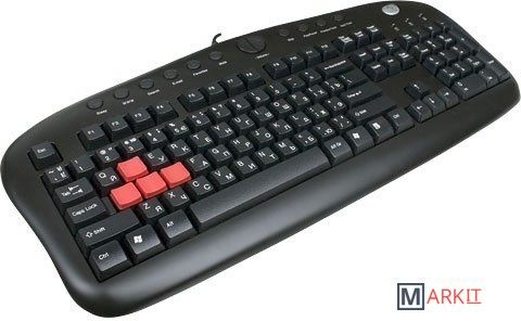 Проводная клавиатура A4Tech KB-28G-1 создана специально для игр. Главная особенность модели – 4 цветных прорезиненных клавиши (A, S, W, D), соответствующие игровым командам «вверх», «вниз», «влево», «вправо».