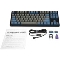 Тип: линейныйСила нажатия: 45 грамм (легкие)Длина пути: 4 мм (2 мм до срабатывания)Данная модель выполнена в сочетании пурпурно-фиолетового, серого и чёрного цветов, расцветка обязательно понравится любителям сочных, но приглушённых красок. Клавиатура собрана добротно и монолитно, а сочетание высококачественных double-shot PBT клавиш с переключателями Cherry MX и звукопоглощающей подложкой позволяет сделать печать на клавиатуре максимально тихой (насколько это возможно для механики). Mini-USB порт спрятан в центре под корпусом, а на самой клавиатуре имеются центральная и две боковые канавки под кабель.Клавиатура поддерживает сочетание клавиш для регулировки громкости и управления музыкой, также имеется возможность переключения между 6KRO и NKRO.DIP-переключатели на задней панелиДают возможность поменять местами функции кнопок Ctrl и Caps Lock, Windows и Alt, Windows и Fn или отключить Windows.Звукопоглощающая подложкаПоглощает звуки при нажатии, делая процесс печати более тихим по сравнению с обычными механическими клавиатурами.Низкопрофильные клавиши Step-Sculpture2Данные клавиши заметно ниже и имеют оптимальный угол наклона, из-за чего, по отзывам, печатать приятнее и комфортнее, чем на более высоких клавишах.Клавиатура совместима с Mac OSFN-слой работает (кроме клавиш F6, F8, F9), а поменять местами клавиши-модификаторы можно в системных настройках. Проверено с MAC OS 10.13Функция Full N-key Rollover по USB (NKRO)Позволяет нажимать одновременно неограниченное количество клавиш. Для печати идеально подойдет как 6KRO, так и NKRO, независимо от вашей скорости. Для игр NKRO будет плюсом и неважно, нажимаете ли вы больше 6 кнопок или нет, поскольку, играя в любую игру, вы можете случайно нажать пару лишних клавиш и из-за этого клавиатура имеет шанс не среагировать на нажатие, которое вы хотели совершить изначально. Имеется возможность переключения между NKRO и 6KRO через FN сочетания.