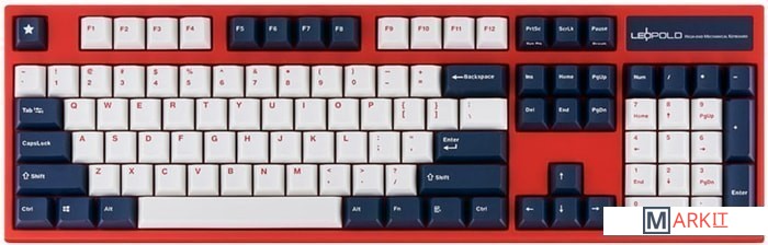 КЛАВИАТУРА БЕЗ КИРИЛЛИЦЫТип: тактильныйСила нажатия: 65 грамм (тяжелые)Длина пути: 4 мм (2 мм до срабатывания)Данная модель имеет красно-белую расцветку с тёмно-синими клавишами-модификаторами — очень смелое и яркое цветовое решение. Клавиатура собрана добротно и монолитно, а сочетание высококачественных double-shot PBT клавиш с переключателями Cherry MX и звукопоглощающей подложки позволяет сделать печать на клавиатуре максимально тихой (насколько это возможно для механики). Mini-USB порт спрятан в центре под корпусом, а на самой клавиатуре имеются центральная и две боковые канавки под кабель.Клавиатура поддерживает сочетание клавиш для регулировки громкости и управления музыкой, также имеется возможность переключения между 6KRO и NKRO.DIP-переключатели на задней панелиДают возможность поменять местами функции кнопок Ctrl и Caps Lock, Windows и Alt, Windows и Fn или отключить Windows.Звукопоглощающая подложкаПоглощает звуки при нажатии, делая процесс печати более тихим по сравнению с обычными механическими клавиатурами.Низкопрофильные клавиши Step-Sculpture2Данные клавиши заметно ниже и имеют оптимальный угол наклона, из-за чего, по отзывам, печатать приятнее и комфортнее, чем на более высоких клавишах.Клавиатура совместима с Mac OSFN-слой работает (кроме клавиш F6, F8, F9), а поменять местами клавиши-модификаторы можно в системных настройках. Проверено с MAC OS 10.13Функция Full N-key Rollover по USB (NKRO)Позволяет нажимать одновременно неограниченное количество клавиш. Для печати идеально подойдет как 6KRO, так и NKRO, независимо от вашей скорости. Для игр NKRO будет плюсом и неважно, нажимаете ли вы больше 6 кнопок или нет, поскольку, играя в любую игру, вы можете случайно нажать пару лишних клавиш и из-за этого клавиатура имеет шанс не среагировать на нажатие, которое вы хотели совершить изначально. Имеется возможность переключения между NKRO и 6KRO через FN сочетания.