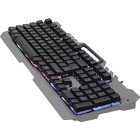 Игровая проводная клавиатура KX-7 имеет металлическую верхнуюю панель, снабженную держателем для мобильного телефона. Прорезиненные ножки предотвращают скольжение клавиатуры по столу. Лазерная гравировка символов позволяет английским и русским символам быть хорошо различимыми в полной темноте. Радужная LED подсветка работает в двух режимах - статичная подсветка и дышащая подсветка.