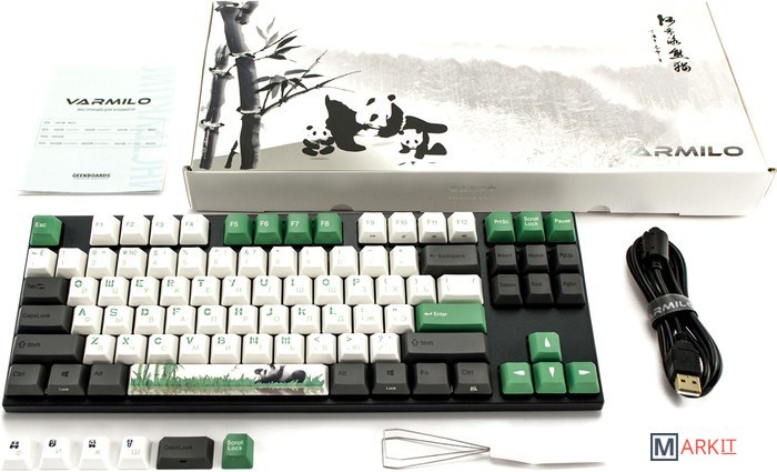 В обновлённой версии клавиатура получила USB Type-C порт взамен старого Mini-USB.Данная модель представлена в необычном серо-зелено-белом цветовом сочетании, на пробеле есть красивый рисунок, буквенные клавиши имеют необычный салатовый шрифт. USB Type-C порт спрятан в центре под корпусом, а на самой клавиатуре имеются центральная и две боковые канавки под кабель.Переключатели EC Switch V2Фирменные переключатели от Varmilo подарят вам отличные ощущения от тайпинга. По сравнению с традиционными переключателями, EC Switch V2 мягче и стабильнее, а также обладают существенно большей долговечностью благодаря индукционному принципу срабатывания (без прямого соприкосновения контактов).Мультимедиа и дополнительные FN функцииКлавиатура поддерживает сочетания клавиш для регулировки громкости и управления музыкой. Также имеется возможность отключить кнопку windows и поменять клавиши Fn и Win/Ctrl и Caps Lock местами.Клавиши толщиной 1.4 ммНовые клавиши V-Silk имеют гладкую поверхность и гораздо меньше притягивают грязь, оставаясь при этом такими же приятными на ощупь, но уже по-новому. Клавиши изготовлены из высокопрочного пластика PBT с применением dye-sublimation технологии, с выгравированными символами на боках. Использование dye-sub позволяет символам никогда не стираться и никак не чувствоваться при печати, а качественный PBT пластик гарантирует надежность и долговечность.Из-за особенности производства символы на клавишах могут быть расположены с небольшим сдвигом.Стабилизаторы, смазанные на заводеСочетание стабилизаторов и смазки позволяет добиться максимально равномерного и плавного хода клавиш enter/space/shift/backspace, а сами клавиши легко снять с клавиатуры.Белая подсветкаИмеется 3 разных режима (выключена, статичное свечение, эффект затухания) и 4 уровня яркости. Режимы меняются через FN + стрелка вправо, FN + стрелка вверх/вниз меняет яркость в режиме статичного свечения и скорость в режиме затухания.Двойные регулируемые ножкиПозволяют установить угол наклона 4, 8 или 12 градусов для более комфортной печати, а их прорезиненный низ не даст клавиатуре сдвинуться с места.Звукопоглощающая подложкаПоглощает звуки при нажатии, делая процесс печати более тихим по сравнению с обычными механическими клавиатурами.Клавиатура полностью совместима с Mac OSВсе мультимедиа и дополнительные FN функции совместимы с MAC OS и работают как полагается, а поменять местами клавиши-модификаторы можно в системных настройках. Проверено с MAC OS 10.13.Функция Full N-key Rollover по USB (NKRO)Позволяет нажимать одновременно неограниченное количество клавиш. Для печати идеально подойдет как 6KRO, так и NKRO независимо от вашей скорости. Для игр NKRO будет плюсом и неважно, нажимаете ли вы больше 6 кнопок или нет, поскольку, играя в любую игру, вы можете случайно нажать пару лишних клавиш и из-за этого клавиатура имеет шанс не среагировать на нажатие, которые вы хотели совершить изначально. Осторожно, старые BIOS-ы могут не реагировать на клавиатуру из-за NKRO.