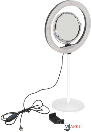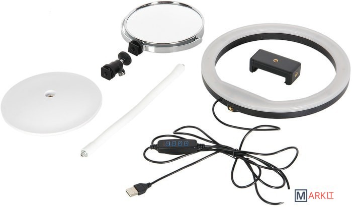 | Комплектация | - Кольцевой осветитель с сетевым кабелем USB - Зеркало - Шаровая мини-головка - Держатель смартфона - Руководство по эксплуатации и гарантийный талон |
