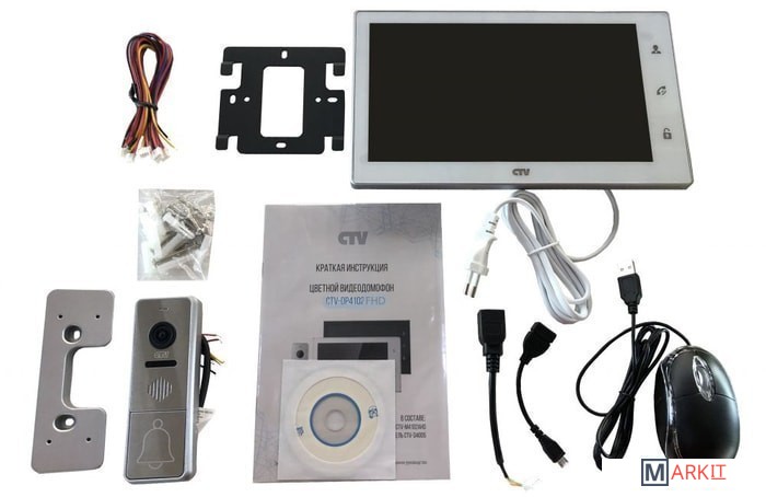 Комплект домофона с экраном 10" с поддержкой разрешения Full HD, Touch Screen, встроенным регистратором, сенсорным управлением, поддержкой облачного сервиса P2P. Цветной видеодомофон CTV-DP4102FHD(Черный), состоящий из цветного монитора CTV-M4102FHD(Черный) и цветной вызывной панели CTV-D4000FHD, работающих в формате видео AHD(1080P), предназначен для организации контроля доступа и двусторонней аудио-видео связи с посетителем. К монитору можно подключить одну или две вызывные панели, одну или две дополнительные внешние камеры, один или два датчика тревоги, а также до 3 дополнительных домофонных мониторов марки CTV, поддерживающих работу в дополнительном режиме.
