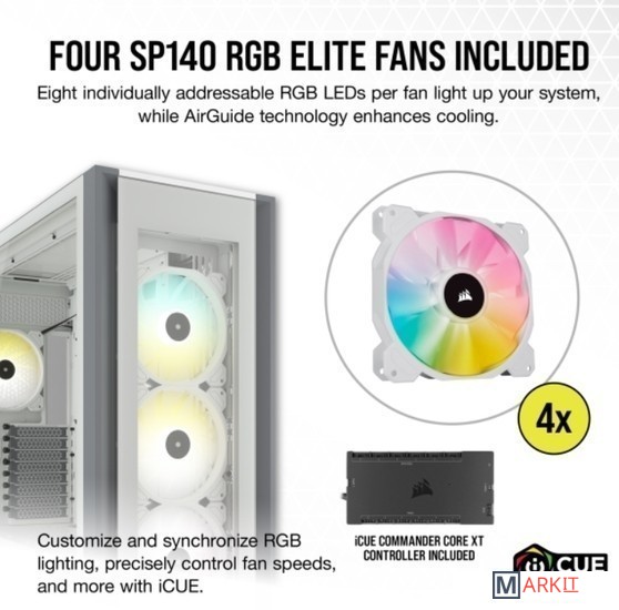 За тремя изготовленными из закаленного стекла панелями корпуса CORSAIR iCUE 7000X RGB формата Full-Tower ATX все компоненты вашей системы будут видны как на ладони: пространство для одновременной установки до трех 360-миллиметровых радиаторов, система скрытой прокладки кабелей и четыре входящих в комплект вентилятора CORSAIR SP140 RGB ELITE.Программное обеспечение CORSAIR iCUE объединяет все настройки, превращая вашу игровую станцию в цельную экосистему с эффектом полного погружения и интуитивно понятным управлением.Корпус iCUE 7000X RGB в сочетании с программным обеспечением CORSAIR iCUE является лучшим в своем классе интеллектуальным корпусом. Программное обеспечение iCUE позволяет легко настраивать RGB-подсветку и управлять скоростью вращения до шести вентиляторов.COMMANDER CORE XT — это больше, чем просто контроллер для управления подсветкой и скоростью вращения до шести вентиляторов. Его функционал можно расширить для мониторинга температуры (два температурных датчика входят в комплект поставки). Кроме того, контроллер COMMANDER CORE XT можно подключить к другим совместимым с iCUE устройствам, таким как полосы подсветки LS100 или комплекты расширения светодиодной RGB-подсветки Lighting PRO.Три прочные панели из закаленного стекла толщиной 4 мм обеспечивают обзор всех компонентов вашей системы.Акцентируйте внимание на своей графической карте с помощью инновационного вертикального крепления для графических карт, которое отличается оптимальным размером для установки самых мощных современных графических карт и обеспечивает достаточное пространство для беспрепятственного воздухообмена.Оснащенный окошком кожух блока питания с возможностью персонализации позволяет увидеть все компоненты системы изнутри. Снимите панель, добавьте виниловую графику, нанесите свой логотип лазером или установите подсветку, чтобы придать вашей системе индивидуальности.Быстро и легко уложите основные кабели в один просторный потайной канал глубиной 25 мм за материнской платой, предусмотренный для всех кабелей, которые легко скрыть за откидной стальной дверцей.
