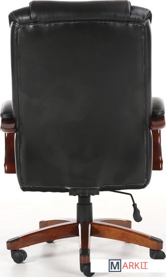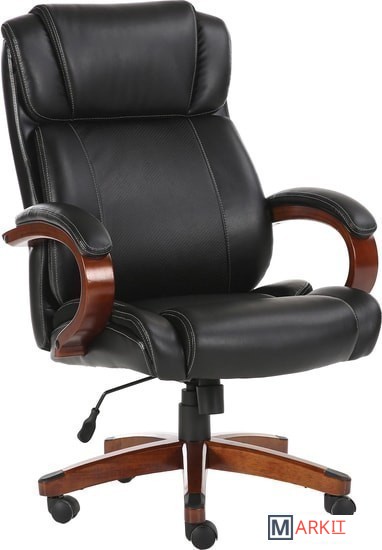 Обивка кресла выполнена из рециклированной кожи - современного материала, созданного из измельченных частиц натуральной кожи. По эластичности и прочности рециклированная кожа максимально близка к натуральной. Материал хорошо пропускает воздух, что положительным образом сказывается на комфорте во время эксплуатаци. Рециклированная кожа износоустойчива, кресло способно сохранять привлекательный внешний вид длительное время.Перфорация в центральной части кресла способствует дополнительной циркуляции воздуха.Плотная набивка, широкие деревянные подлокотники с мягкими накладками, высокая спинка и широкое сиденье с плотной набикой - просторные габариты обеспечивают великолепную эргономику данной модели.Сочетание рециклированной кожи с контрастной отстрочкой и деревянных элементов без сомнений подчеркнут статус своего владельца.