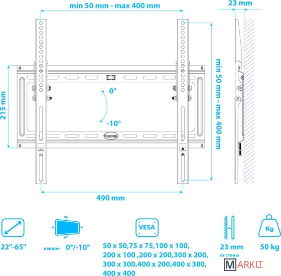 | Совместимость с креплением VESA | 50x50, 75x75, 100x100, 200x100, 200x200, 300x200, 300x300, 400x200, 400x300, 400x400 |