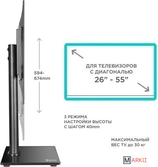 ПОДХОДИТ ДЛЯ ШИРОКОГО МОДЕЛЬНОГО РЯДА ТВ Если существует потребность установить ТВ на горизонтальную поверхность, а стандартная подставка отсутствует или не вписывается в существующий интерьер разумным решением станет настольная подставка РТ1 . Подставка позволяет не только установить ТВ но и отрегулировать его по высоте.ШИРОКИЙ ДИАПАЗОН VESA КРЕПЛЕНИЙПеремещая направляющие на основании кронштейна можно выбирать подходящее для ТВ крепление в диапазоне от 75х75 до 400х400 мм в зависимости от диагонали ТВ.УНИВЕРСАЛЬНАЯ ПОДСТАВКА ДЛЯ ТВНастольная подставка предназначена для плоскопанельных телевизоров с диагональю экрана от 32 до 55 дюймов, что делает её более универсальной в сравнении с аналогами.Вы сможете с легкостью регулировать телевизор по высоте в диапазоне от 594 до 674 мм, в зависимости от диагонали ТВ и ваших личных предпочтений.ПРЕМИАЛЬНЫЙ ДИЗАЙНПрочное основание из закаленного стекла толщиной 10 мм не только обеспечит устойчивое, надежное крепление ТВ, но и дополнит любой интерьер. Черное, глянцевое основание прекрасно впишется в интерьер как жилого помещения так и дополнит рабочее пространство.