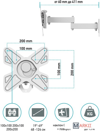 | Расстояние от стены (потолка) | 60 — 411 мм |