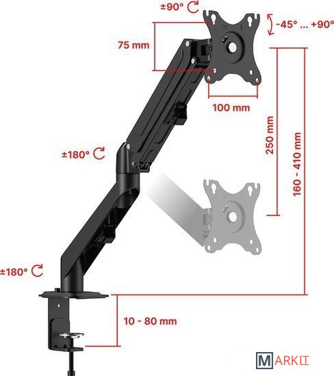 | Функциональные особенности | поворотный, с регулировкой высоты, кабель-канал, струбцинное крепление |