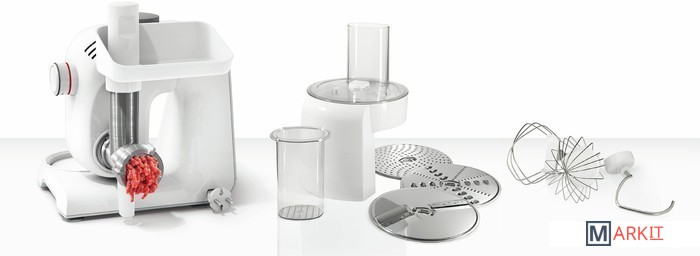 | Функции | мясорубка, взбивание, смешивание, замешивание дрожжевого теста, терка, шинковка, ломтерезка |