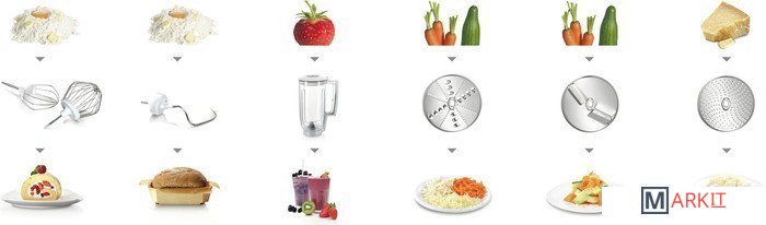 | Функции | блендер, взбивание, смешивание, замешивание дрожжевого теста, терка, шинковка, ломтерезка |