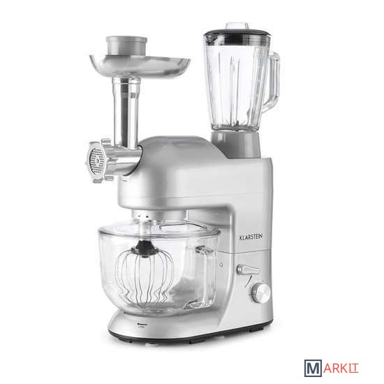 Блендер 1,5лМясорубка с 3-мя сменными дисками разной величины измельчения, насадка для колбас, пасты (6 дисков)Чаша 5,2лВенчикНасадка для смешиванияНасадка для тестаКрышка от брызг