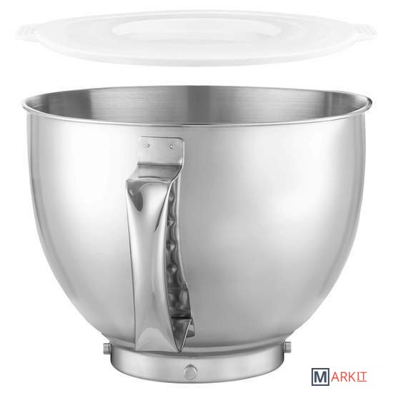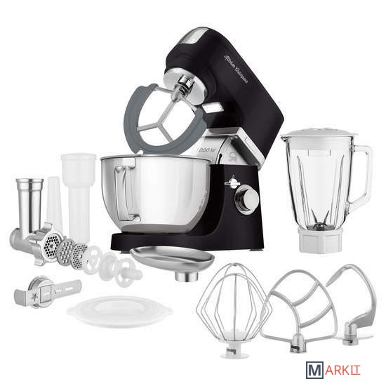 Чаша 4,5лБлендер 1,5лНасадка для смешиванияГибкая насадка для смешиванияНасадка для тестаВенчикМясорубка: 2 решетки, насадка для колбас, кеббе, толкатель, насадка для изготовления печенья