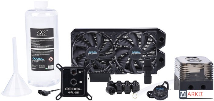 Жидкостное охлаждение с радиаторным блоком для внутреннего или наружного крепления с прозрачным хладагентом.• Радиатор медный NexXxoS ST30 240 мм;• Резервуар Eisstation;• Помпа DC-LT 2600;• Водоблок NexXxoS XP3 Light;• Вентиляторы Eiswind Pure Edition 120 мм (2 шт.);• Охлаждающая жидкость прозрачного цвета CKC Cape Kevin Catchher 1000 мл;• Фитинг (8 шт.);• Трубки 13/10 мм (3 м);• Воронка (1 шт.);• Кабели питания;