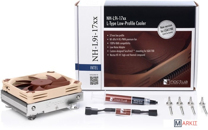 NH-L9i-17xx - это последняя версия отмеченного наградами низкопрофильного кулера Noctua NH-L9i, специально разработанного для LGA1700, для HTPC на базе Intel-LGA17xx и систем с малым форм-фактором (SFF). При высоте всего 37 мм NH-L9i идеально подходит для очень тонких корпусов и, благодаря своей небольшой занимаемой площади, обеспечивает 100% совместимость с ОЗУ и PCIe, а также легкий доступ к ближайшим разъемам даже на плотно упакованных mini-ITX материнских платах.