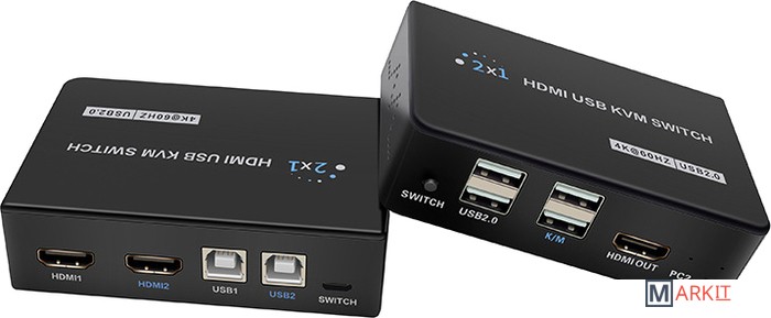 Двух портовый KVM-переключатель 4K HDMI USB позволяет управлять двумя устройствами с выходами HDMI UBS (компьютер, ноутбук и т.п.) с помощью одного дисплея, клавиатуры и мыши. Переключать можно с кнопки на корпусе устройства или выносной кнопки. Дополнительные порты USB2.0 позволяют подключить принтер, сканер, флешку и т.п.Широкая совместимость KVM-переключателя позволяет автоматически идентифицировать и сочетать различные подключаемые устройства, такие как ПК, ноутбук, Apple TV, PS3/PS4, Xbox, Sony, Blu-Ray плеер, HD DVR, спутниковый ресивер, TV-box, проектор, аудио/видео приемники и большинство устройств с поддержкой HDMI.