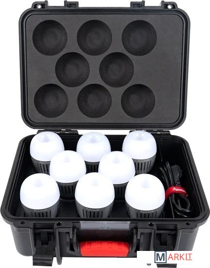 Набор из 8-ми осветителей Aputure Accent B7c, выполненных в форме обычной лампочки с цоколем Е26/Е27.В основе лежат профессиональные светодиоды, работающие с частотой 20 кГц, что обеспечивает отсутствие мерцания даже при рапидной съемке до 1000 кадров в секунду, а также диммирование без цветового сдвига. Кроме того, в корпус лампы встроен собственный литиевый аккумулятор, который обеспечивает ей до 70 минут работы на максимальной яркости. Лампа управляется через мобильное приложение Sidus Link, которое работает напрямую по Bluetooth, не требуется подключать лампы к определенной Wi-Fi сети.Поставляются в жестком пластиковом кофре.