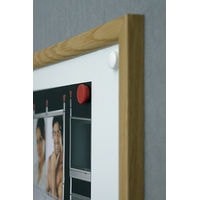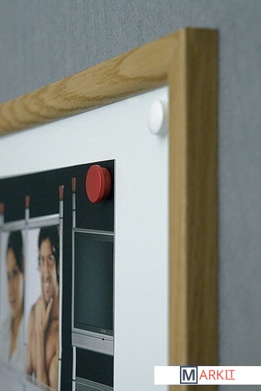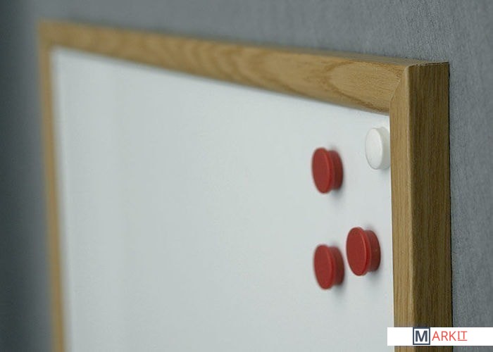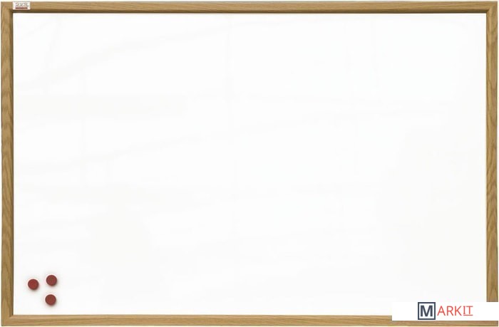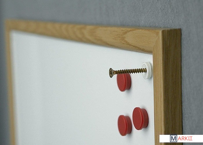Износостойкая поверхность для письма сухостираемыми маркерами и прикрепления информации магнитами. Рамка из планки MDF дубовой расцветки. Крепление к стене в четырех углах.