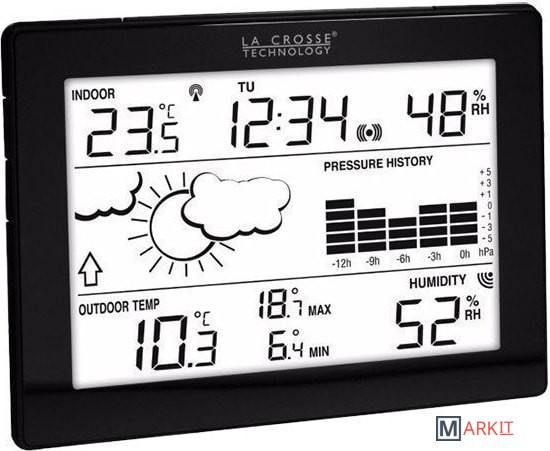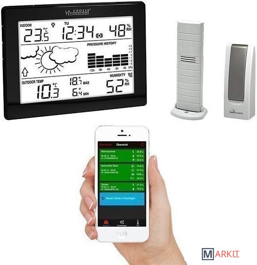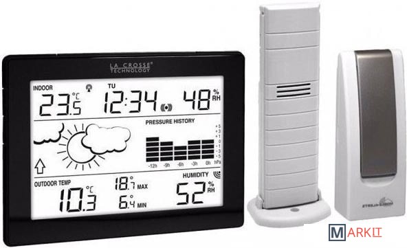 Домашняя метеостанция LaCrosse MA10006 многофункциональное устройство для мониторинга температуры и влажности в доме и за его пределами, а также для прогнозирования метеоданных.Состоит из основного блока с ЖК-дисплеем, беспроводного внешнего датчика, мобильного шлюза для передачи данных на смартфон.