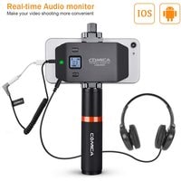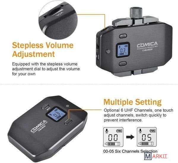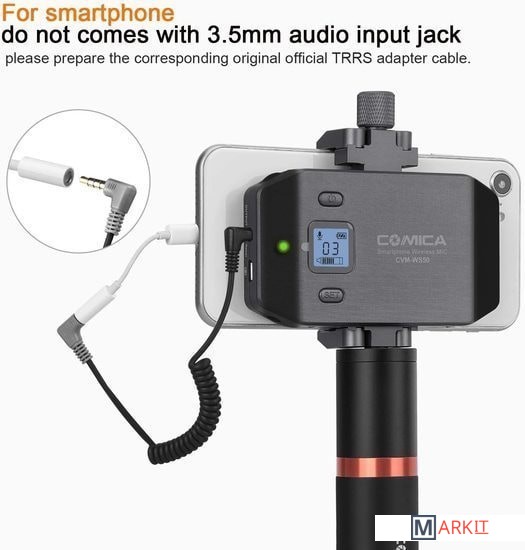 Радиосистема CVM-WS50B с петличным микрофоном идеальна для записи блога или ведения трансляции со смартфона. Также, модель отлично подойдет любителям мобильного кино, поскольку позволяет быстро и качественно записать звук и сэкономить время на сведении.Устройство имеет 6 переключаемых каналов связи, и передаёт сигнал на расстояние до 60 м на открытом пространстве без препятствий. В случае, если во время работы на записи слышны помехи, рекомендуется перевести смартфон в режим "полета".На корпусе трансмиттера и ресивера присутствует ЖК дисплей, показывающий режим работы, номер канала, состояние батареи и уровень сигнала. На ресивере добавлен разъём mini Jack для подключения наушников, что позволяет следить за качеством звука во время съёмки. Зарядить устройство можно при помощи стандартного micro USB.Металлический держатель для смартфона и удобная ручка упрощают работу с записью видео и звука, ведь вы можете снимать установив передатчик в непосредственной близости от мобильного устройства. Это позволяет не путаться в надоедливых проводах и держать всё необходимое в одном месте. К тому же, в затяжном болте держателя предусмотрено крепление 1/4", на него вы можете установить дополнительное оборудование для съёмки.